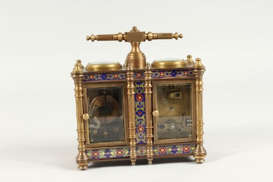 A GOOD CLOISONNE DOUBLE FRENCH CLOCK WITH CLOCK BAROMETER.