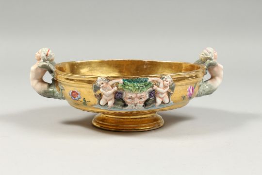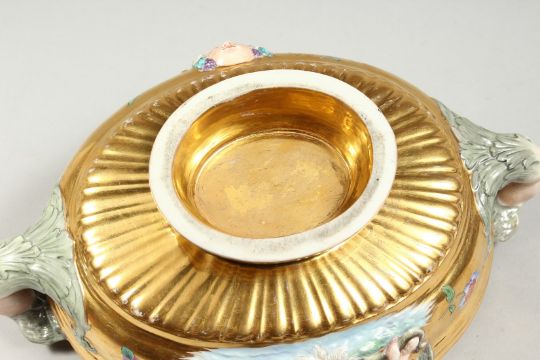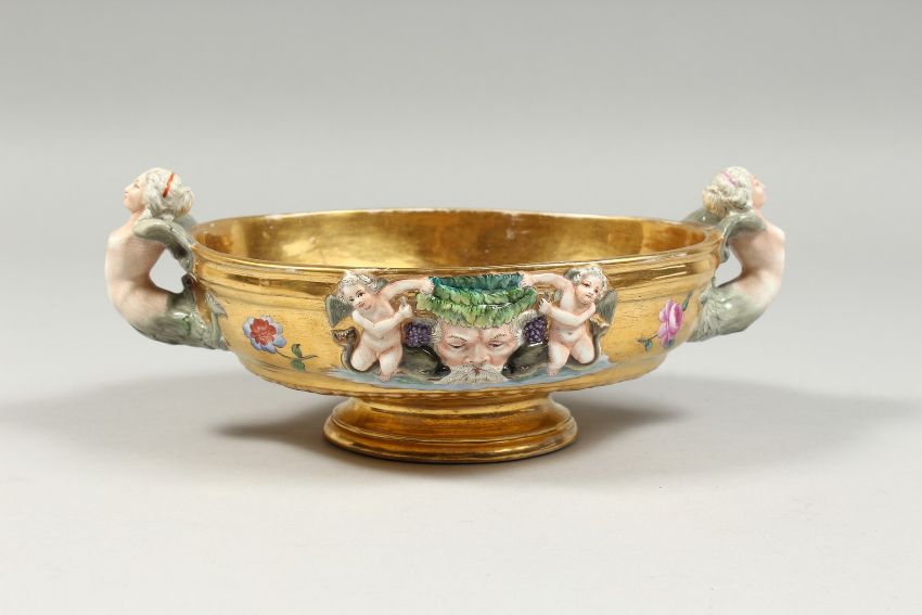 A GOOD BERLIN GILT GROUND OVAL BOWL with mermaid handles, masks and flowers.