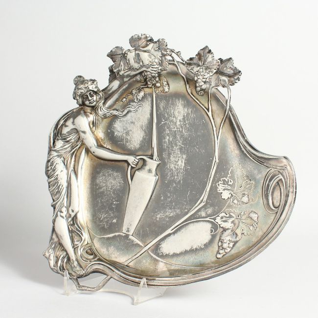 AN ART NOUVEAU PLATED DISH, classical young lady with jug and fruiting vines.