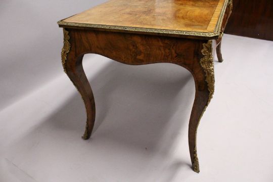A GOOD LOUIS XVI STYLE FIGURES WALNUT BUREAU PLAT, with cross banded top , ormolu mounts , two freze drawers on cabriole legs.