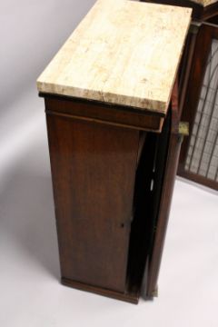 A GOOD PAIR OF REGENCY MAHOGANY PIER CABINETS with beige marble tops, brass grilled and pleated silk doors, flanked by half turned columns with ormolu mounts, supported on plinth bases.
