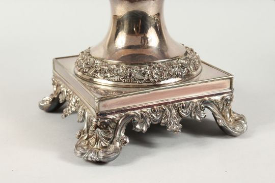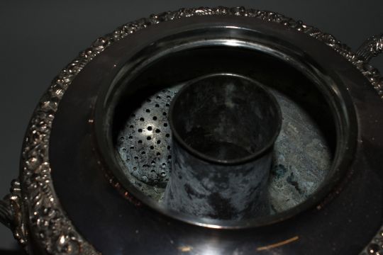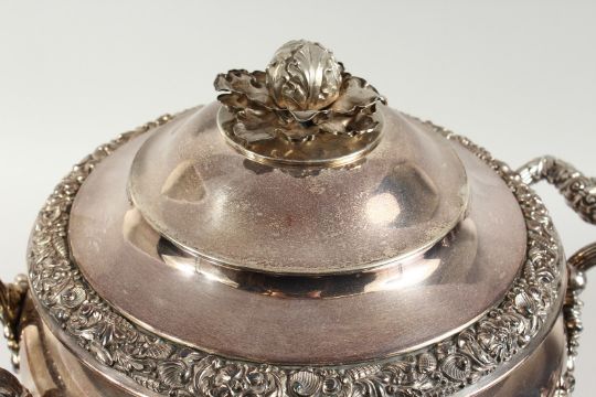 A GOOD OLD SHEFFIELD PLATE CIRCULAR SAMOVAR with cast decoration, scrolls acanthus etc., with looped carrying handles.