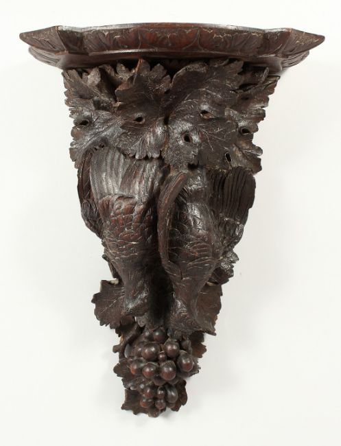 A BLACK FOREST CARVED WOOD WALL BRACKET, game, grapes and leaves.