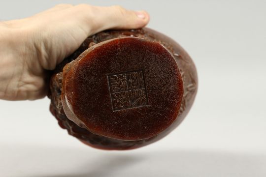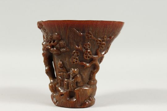 A LARGE CHINESE LIBATION CUP carved with figures, probably resin.