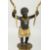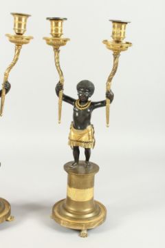 A SUPERB PAIR OF EMPIRE BRONZE AND GILT BRONZE TWO BRANCH CANDLESTICKS of nubian children holding aloft scrolling branches on circular bases on claw feet.