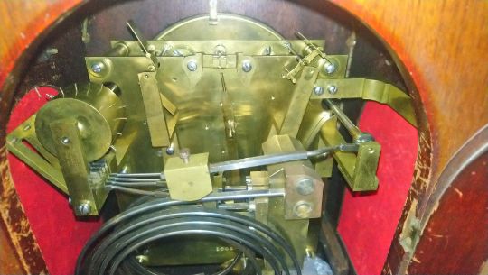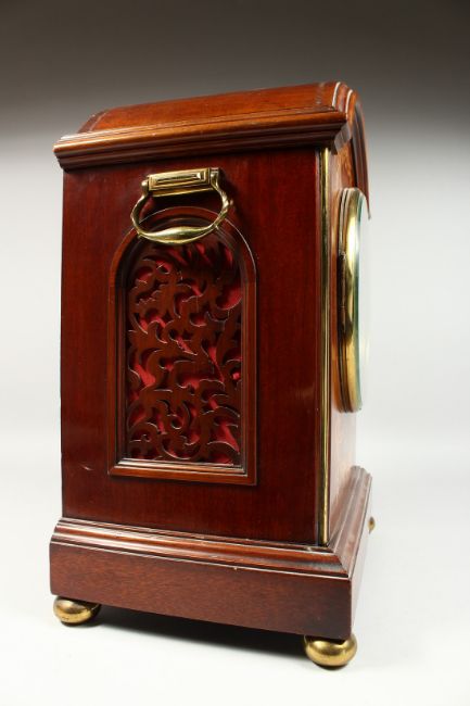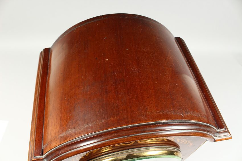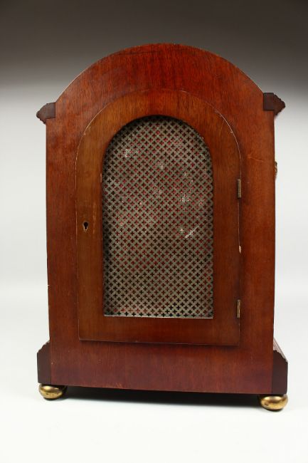 A GOOD MAHOGANY INLAID MUSICAL BRACKET CLOCK, with dial, 8 day movement, sitting on four hammers
