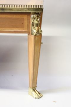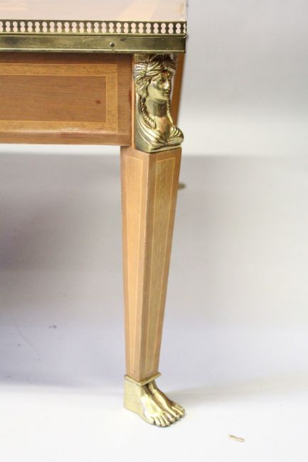 A LOUIS XVITH SQUARE TOP COFFEE TABLE, with inlaid topand brass grill on Egyptian brass legs with sphinx and claw feet.