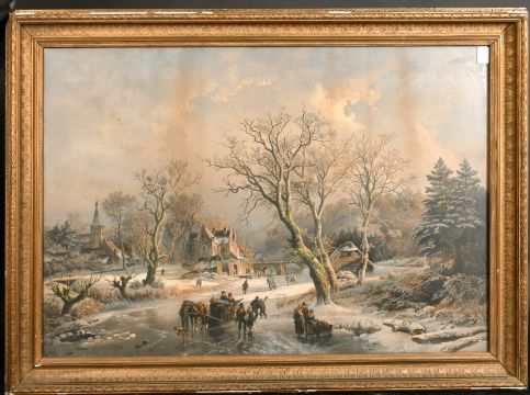 After B. C. Koekkoek, villagers on a frozen waterway, lithograph, 23" x 34".