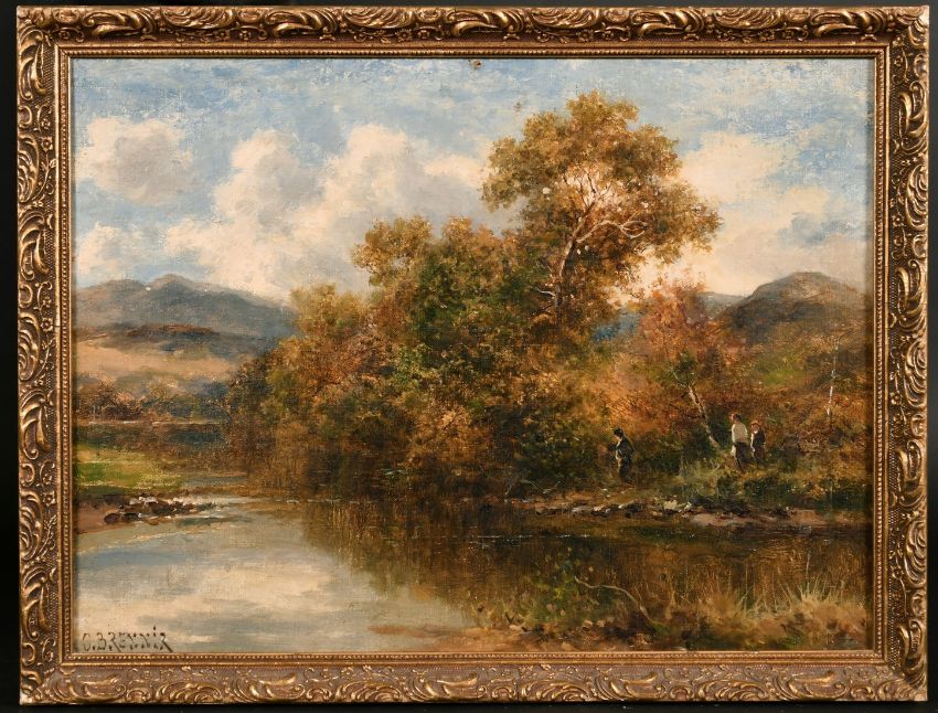 Carl Brennir (1850-1920) British, figures by a river with hills beyond, oil on canvas laid down, signed, 12" x 16".
