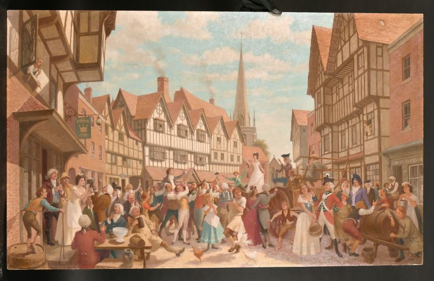 Eadie, circa 1958, A town celebration of a wedding with figures rejoicing, oil on panel, signed and dated, 29" x 48", (unframed).