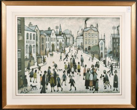 After Lowry, A print of a street scene with figures, 18" x 24".