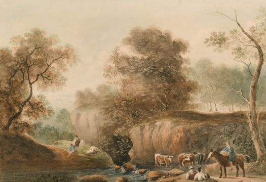Thomas Barker of Bath (1769-1847) British. A Scene of Cattle Crossing a River with Figures Conversing in the Foreground, Watercolour. 8.5" x 12.5".