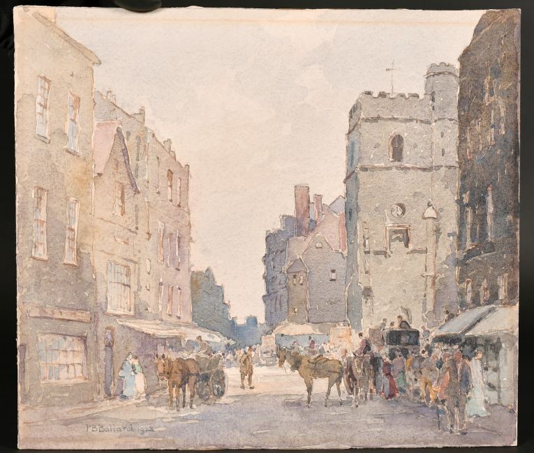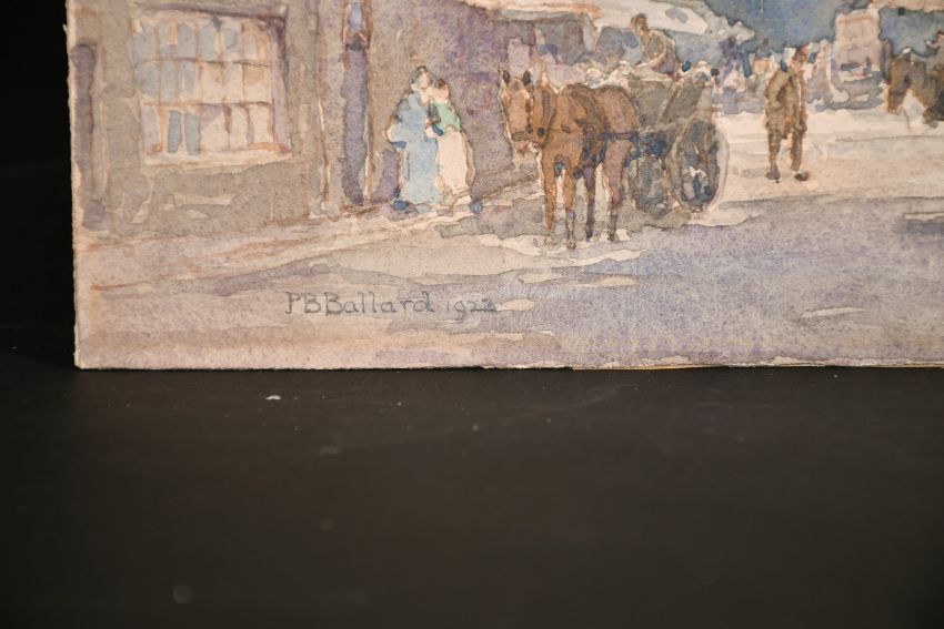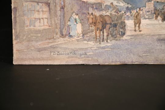 P.B. Ballard, A bustling street scene with figures and carriages, watercolour, signed and dated '1923', 11" x 12.5", (unframed).