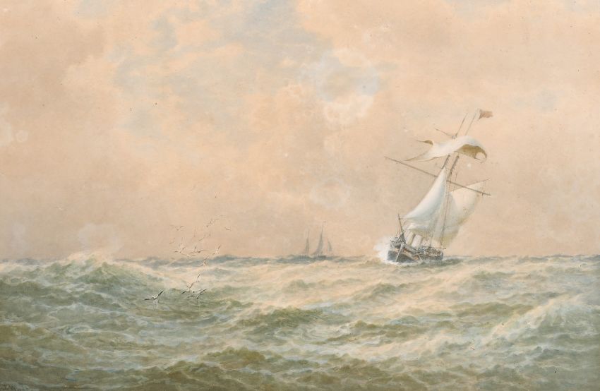 George Stanfield Walters (19th/20th century) British, 'Shortening Sail for Pilot of Helwick, Bristol Chanel', signed and dated '1889', 20" x 30".