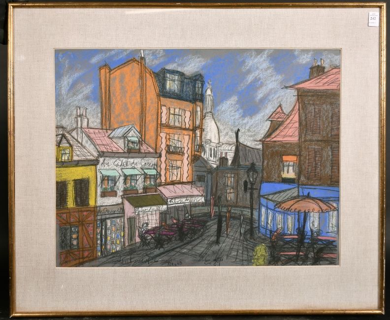 20th century school, 'Montmartre, Paris', A street scene with the Basilica of the Sacre-Coeur in the distance, pastel, indistinctly signed and dated '71', 19" x 25".