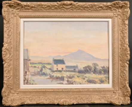 Hugh Boycott Brown (1909-1990) British, A view of a cottage at sunset with mountains beyond, oil on board, signed with initials, 12" x 16".