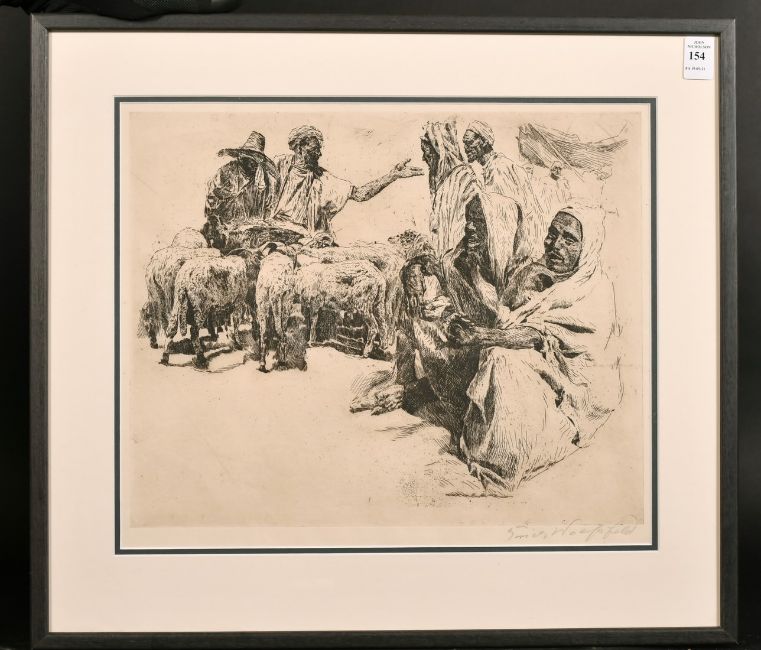 Erich Wolfsfield (1885-1956) German, A North African scene of figures bartering livestock, etching, signed in pencil, 12" x 15".