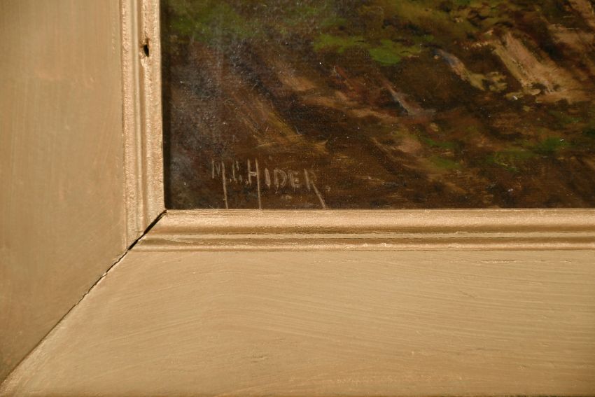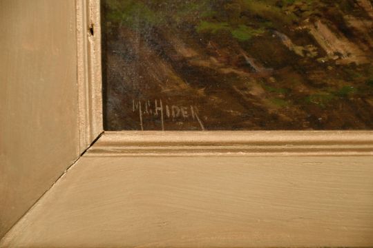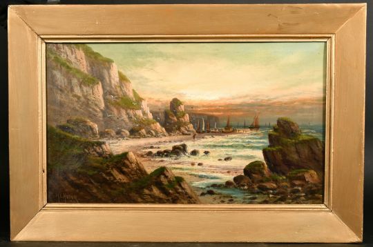 M. C. Hider (19th/20th century) British, a coastal scene with figures and boats by a rocky headland, oil on canvas, signed, 12" x 20".