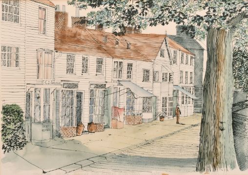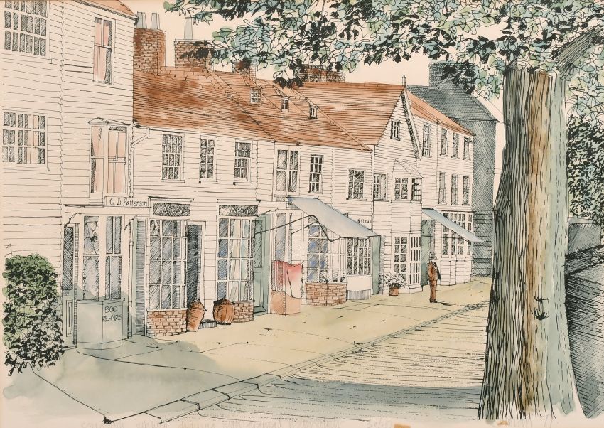 English school, Circa 1977, A view of a town street, serigraph and watercolour, signed and numbered 30/50 in pencil, 12" x 17".