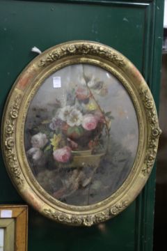 A pair of reverse paintings on glass in gilt frames, together with a decorative porcelain plaque (As found).