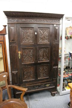 A Jacobean revival oak hanging cupboard with panelled door and single drawer, all with carved decoration.