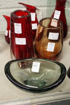 A Whitefriars oval smoker's bowl, an amber controlled bubble vase and a red vase.