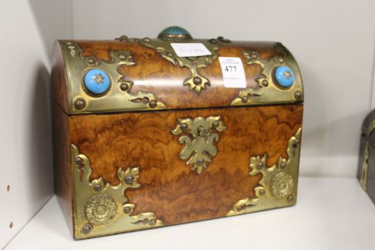 A Victorian walnut stationery casket with brass mounts and cabochon stones.