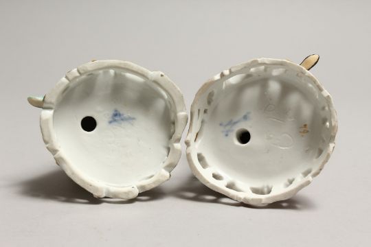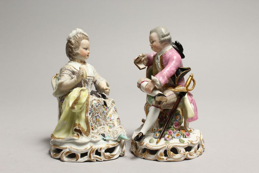 A GOOD PAIR OF MEISSEN PORCELAIN FIGURES, a young man reading a book, a girl sewing.