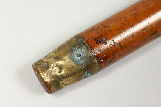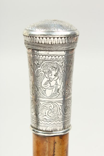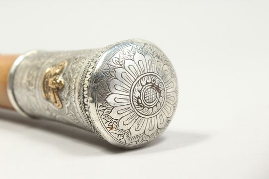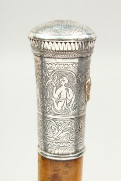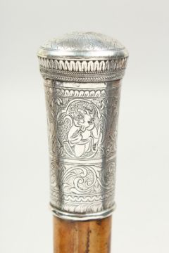 A 19TH CENTURY CEREMONIAL CANE with engraved silver top with a crown.