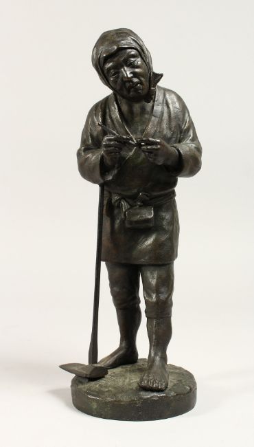 A JAPANESE BRONZE STANDING FIGURE OF A MAN holding a pipe and shovel.