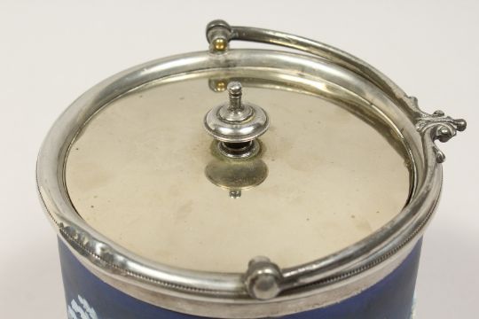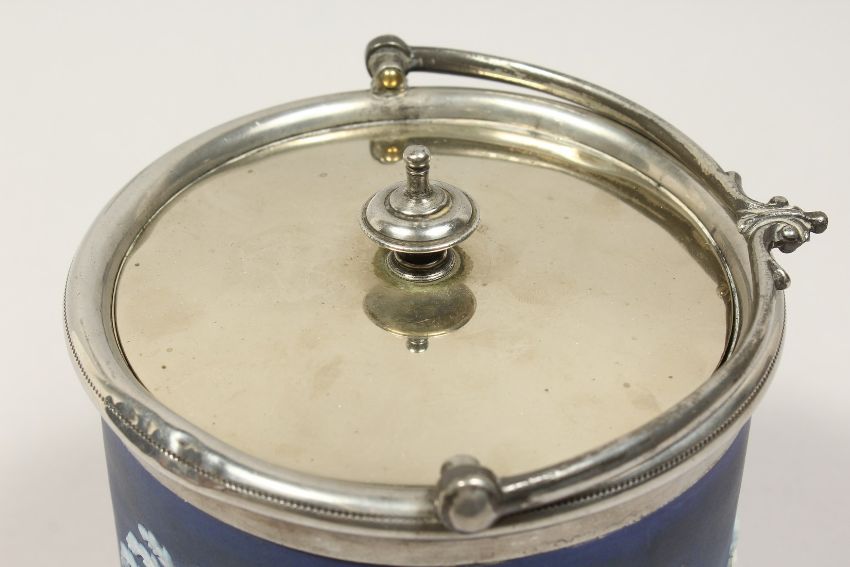 A WEDGWOOD BLUE AND WHITE JASPER WARE BISCUIT BARREL
