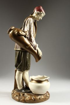 A ROYAL WORCESTER PORCELAIN FIGURE OF A TURK by Hadley, standing, pouring from a jug, into a bowl.