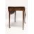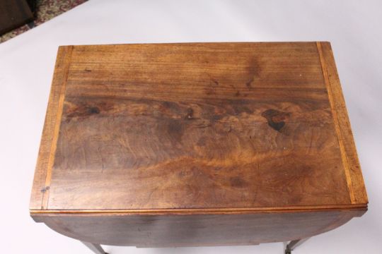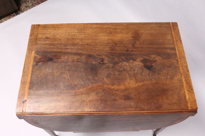 A GEORGE III MAHOGANY BUTTERFLY PEMBROKE TABLE with crossbanded top, shaped flaps, end drawer on tapering legs and casters.