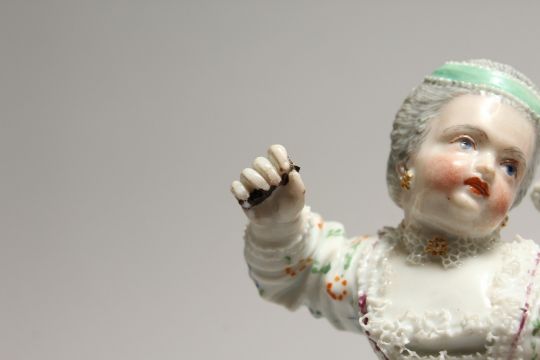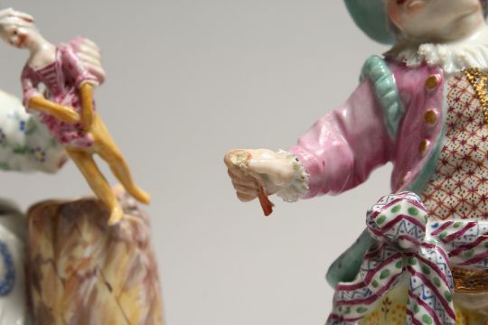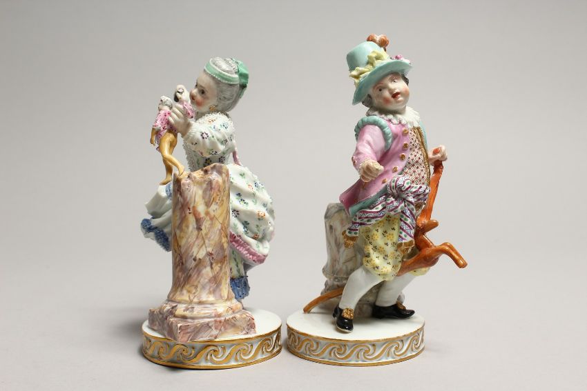 A GOOD PAIR OF MEISSEN PORCELAIN FIGURES a boy holding a hobby horse and a young girl with a doll. Crossed swords mark in blue, incised No. E.95. 6ins high.