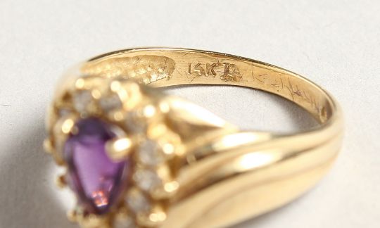 A 14CT GOLD, AMETHYST AND DIAMOND TEAR DROP RING