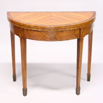 A GEORGE III SATINWOOD HALF MOON CARD TABLE with crossbanded folding top, beige cover on tapering legs with vase feet.