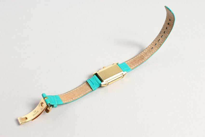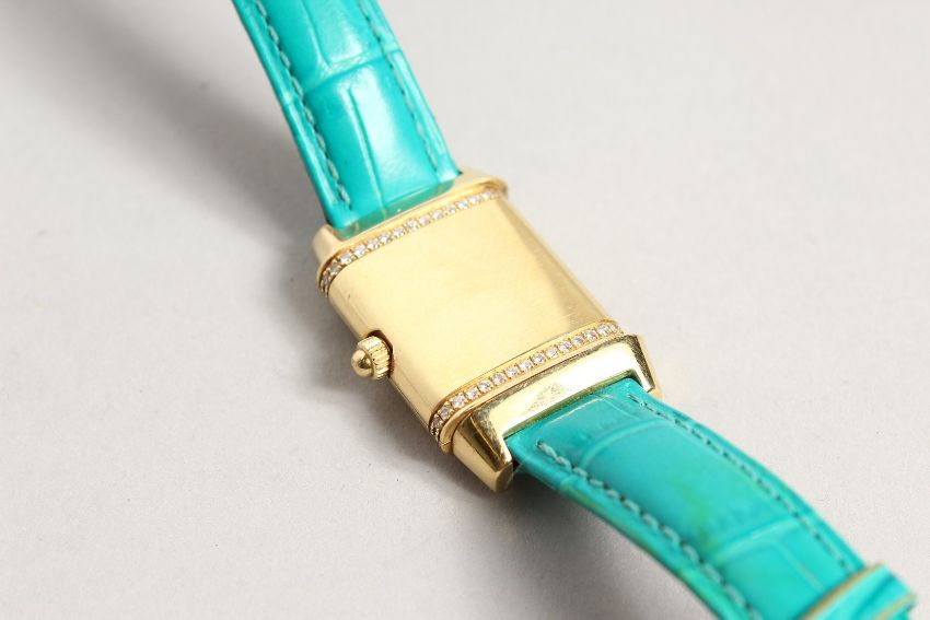 A VERY GOOD 18CT. GOLD AND DIAMOND JAGEUR LE COUTRE REVERSE WRISTWATCH, with a leather strap.