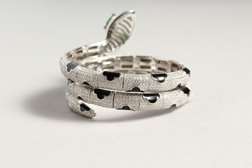 A SILVER ZIRCON AND ENAMEL SNAKE BRACELET.