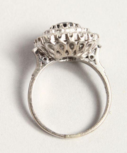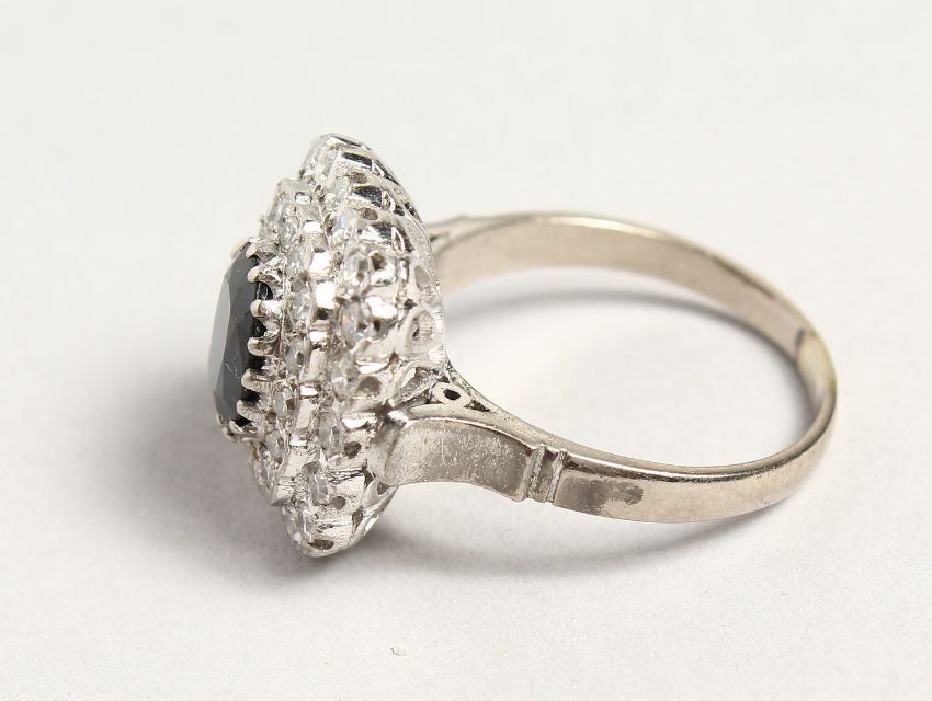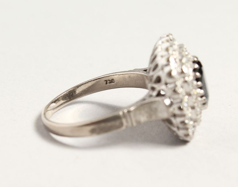 A SUPERB 18CT WHITE GOLD SAPPHIRE AND DIAMOND CLUSTER RING.
