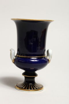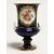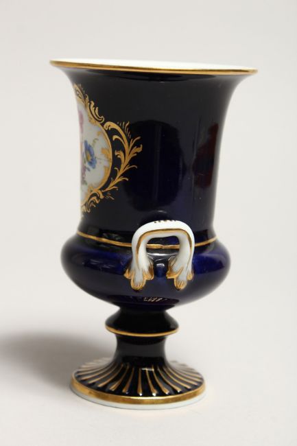 A SMALL MEISSEN TWO HANDLED URN on a blue ground painted with a panel of flowers.