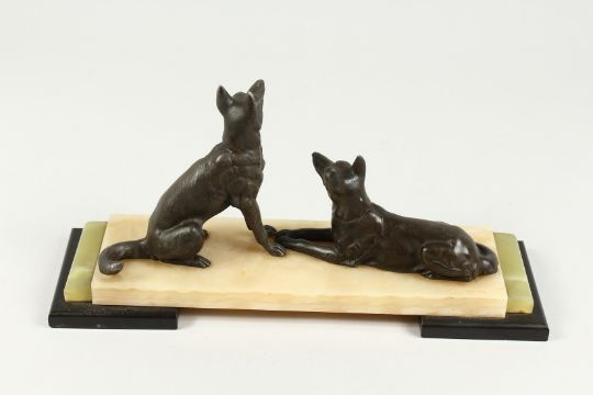 AN ART DECO ONYX AND BRONZE GROUP OF TWO ALSATIONS.