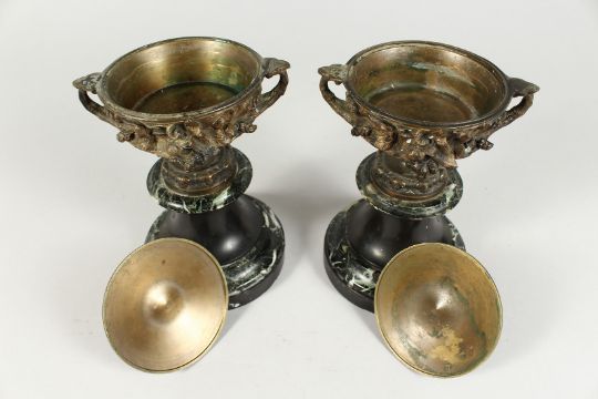 A PAIR OF BRONZE TWO HANDLED URNS AND COVERS on circular marble bases.