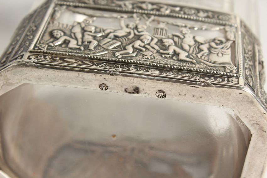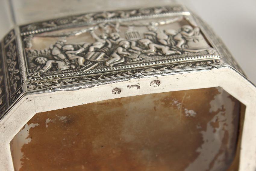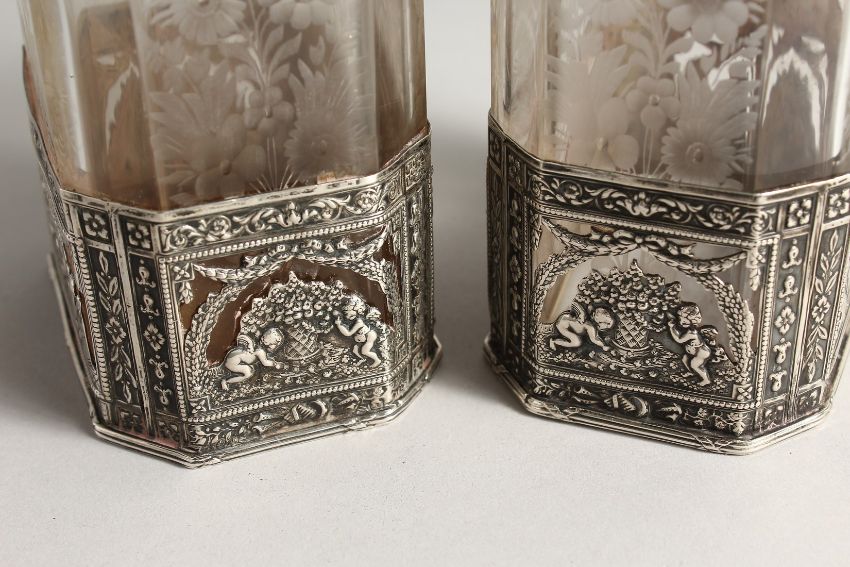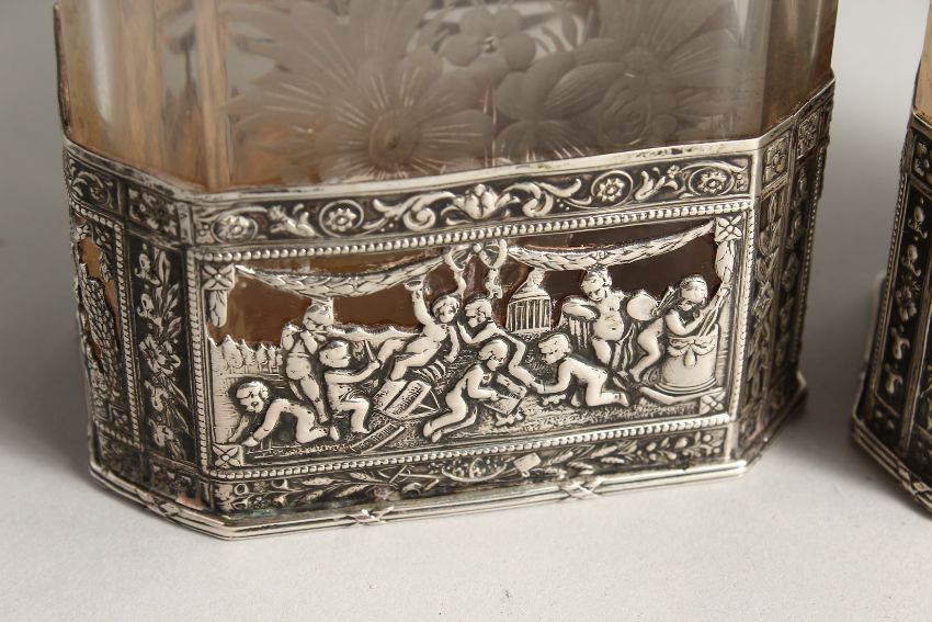 A VERY GOOD PAIR OF EUROPEAN SILVER MOUNTED ETCHED GLASS RECTANGULAR WINE BOTTLE, the glass etched with flowers, the silver with putti, the stoppers with silver figures.