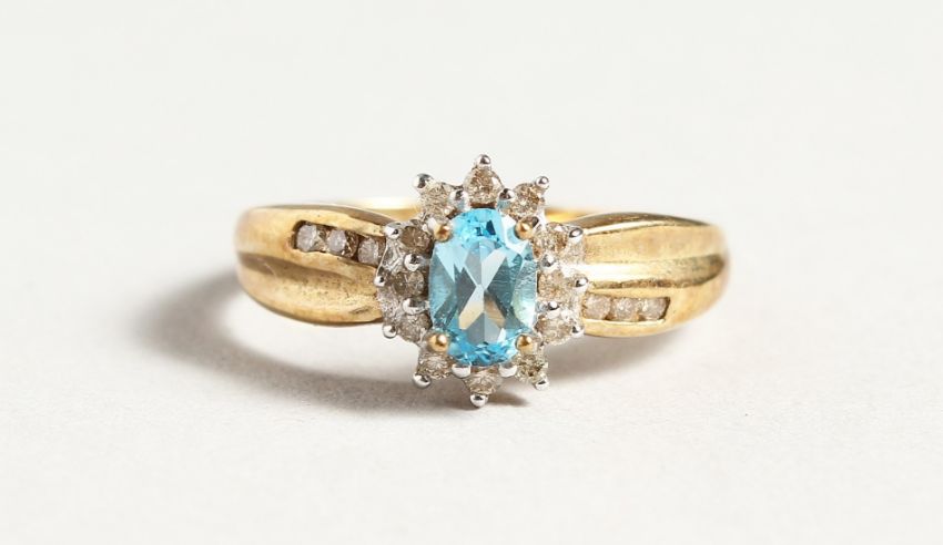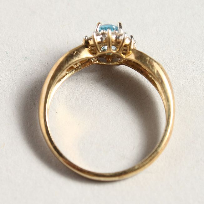 A 9CT GOLD BLUE TOPAZ AND DIAMOND CLUSTER RING