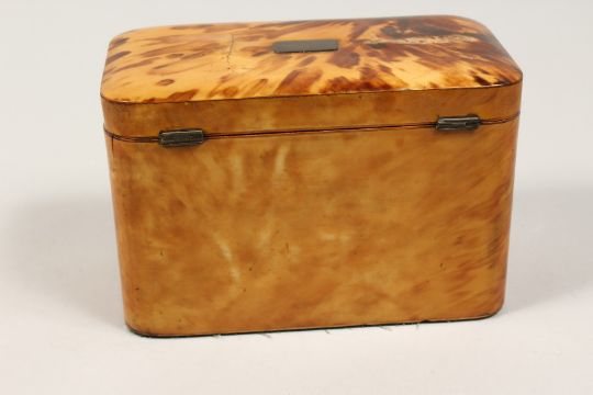 A GOOD REGENCY TORTOISESHELL TWO DIVISION TEA CADDY of rectangular form.