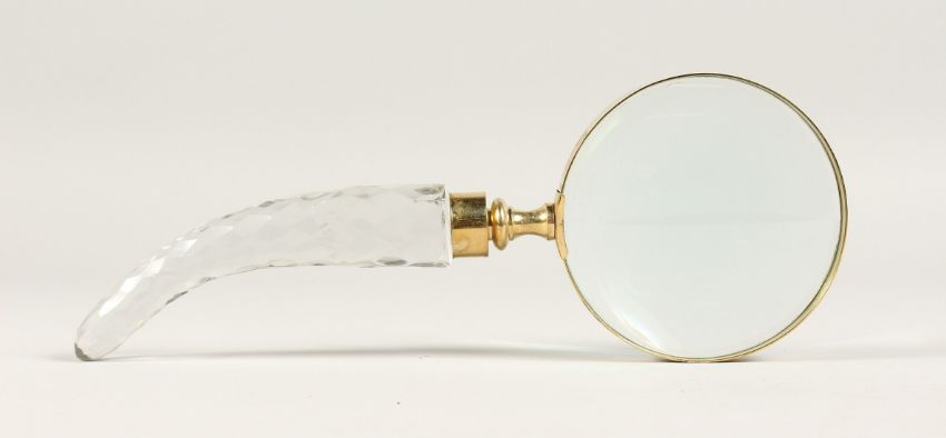A MAGNIFYING GLASS with a cut glass handle.