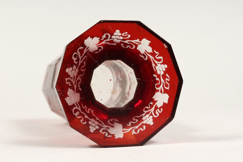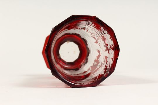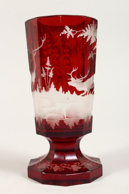 A BOHEMIAN RUBY TINTED GOBLET etched with deer.
