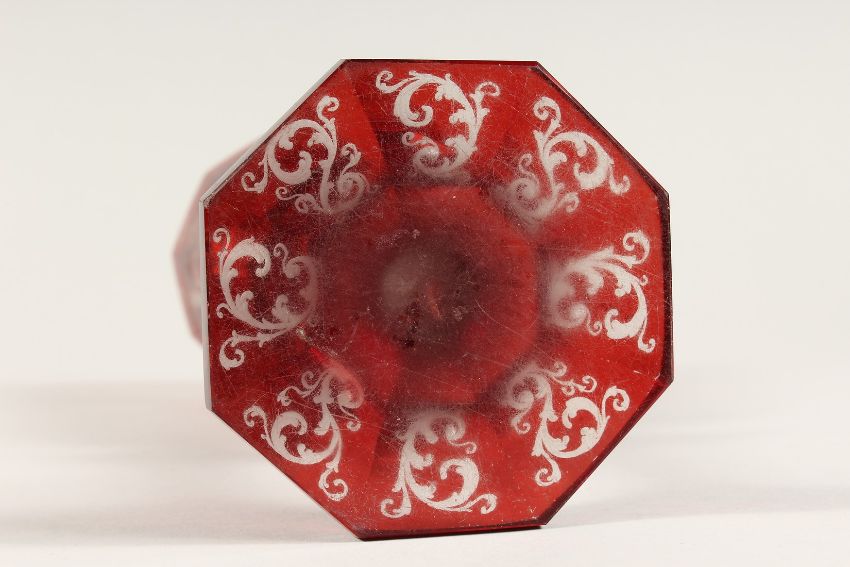 A SUPERB LARGE BOHEMIAN GLASS GOBLET of octagonal shape, etched with deer in a landscape, on an octagonal base.