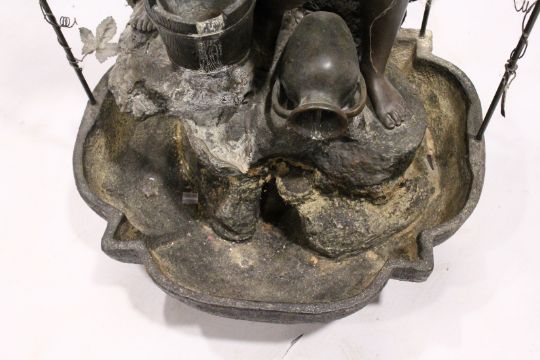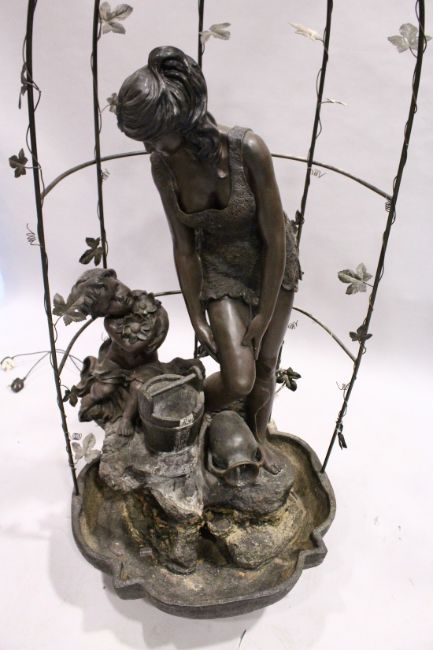 A FINE BRONZED WATER FEATURE, a classical female and Cupid standing on a metal base and arbour.