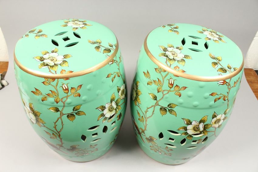 A PAIR OF CHINESE GREEN FLORAL DECORATED SEATS